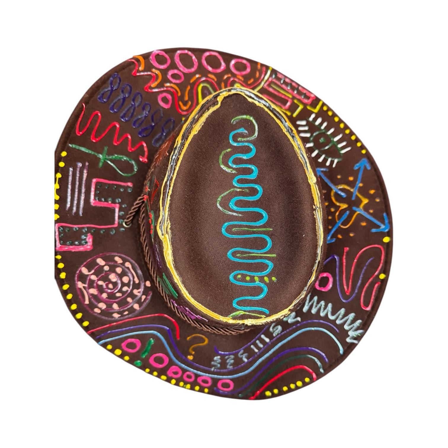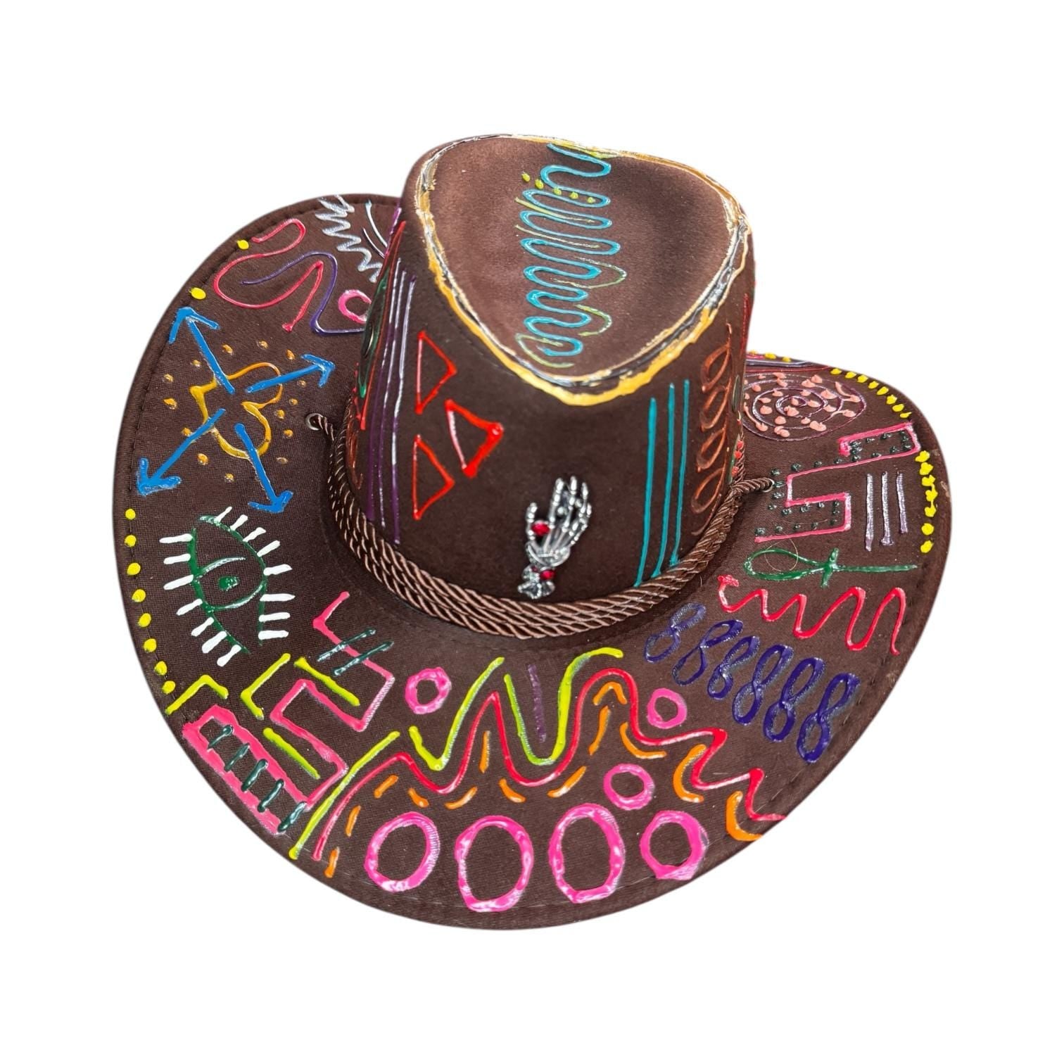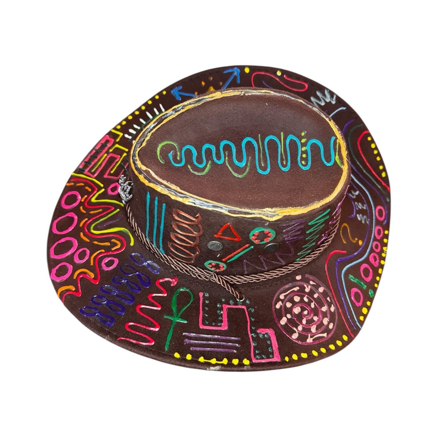 A vibrant fusion of symbolism and spontaneity, this psychedelic brown rave hat pulses with neon tribal forms and radiant shapes. Every inch is hand-painted, forming a rhythmic language of color and motion. The swirling patterns, cosmic motifs, and whimsical neon lines make it an ideal centerpiece for Burning Man, festivals, or bold streetwear.